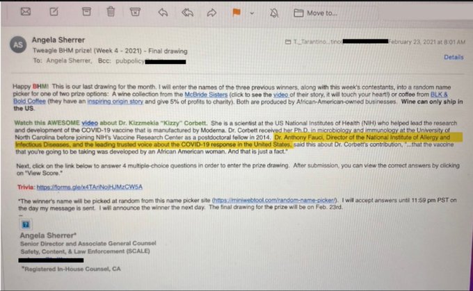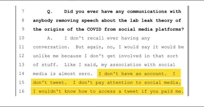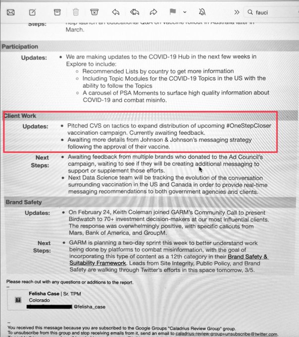 Fauci ha sempre negato di usare Twitter, anche sotto giuramento. Eppure, da un documento interno del marzo 2021 risulta che abbia acquisito l’account @WHOCOVIDResponse e che nell’aprile 2021 abbia assunto il controllo dell’account di risposta al COVID-19 della Casa Bianca. Nel frattempo, Twitter non solo collaborava con compagnie farmaceutiche e catene di farmacie per censurare opinioni contrarie alla vaccinazione di massa, ma dava spazio alle campagne promozionali di Johnson&Johnson, incluso un controverso antidepressivo.